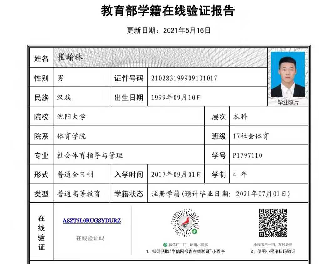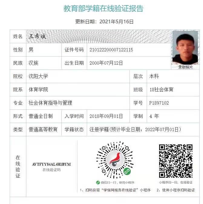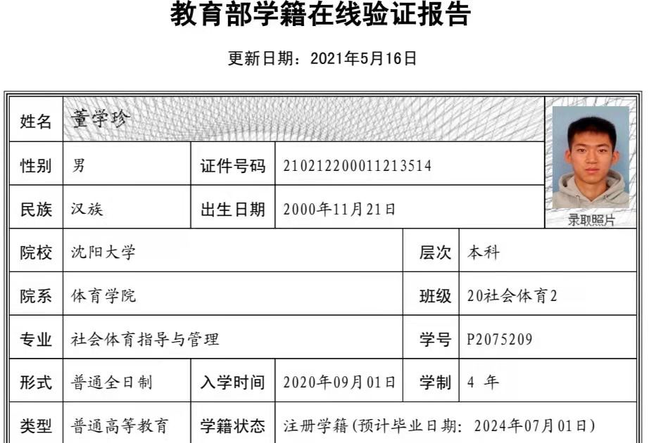 | 5110 | 董学珍 | 男 | 181cm | 75kg | 2000-11-21 | 210212200011213514 | 丁组 | ![]() |