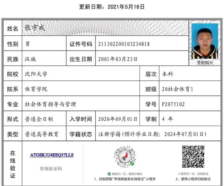 | 5103 | 张宇成 | 男 | 183cm | 75kg | 2001-03-23 | 211302200103234818 | 丁组 | ![]() |