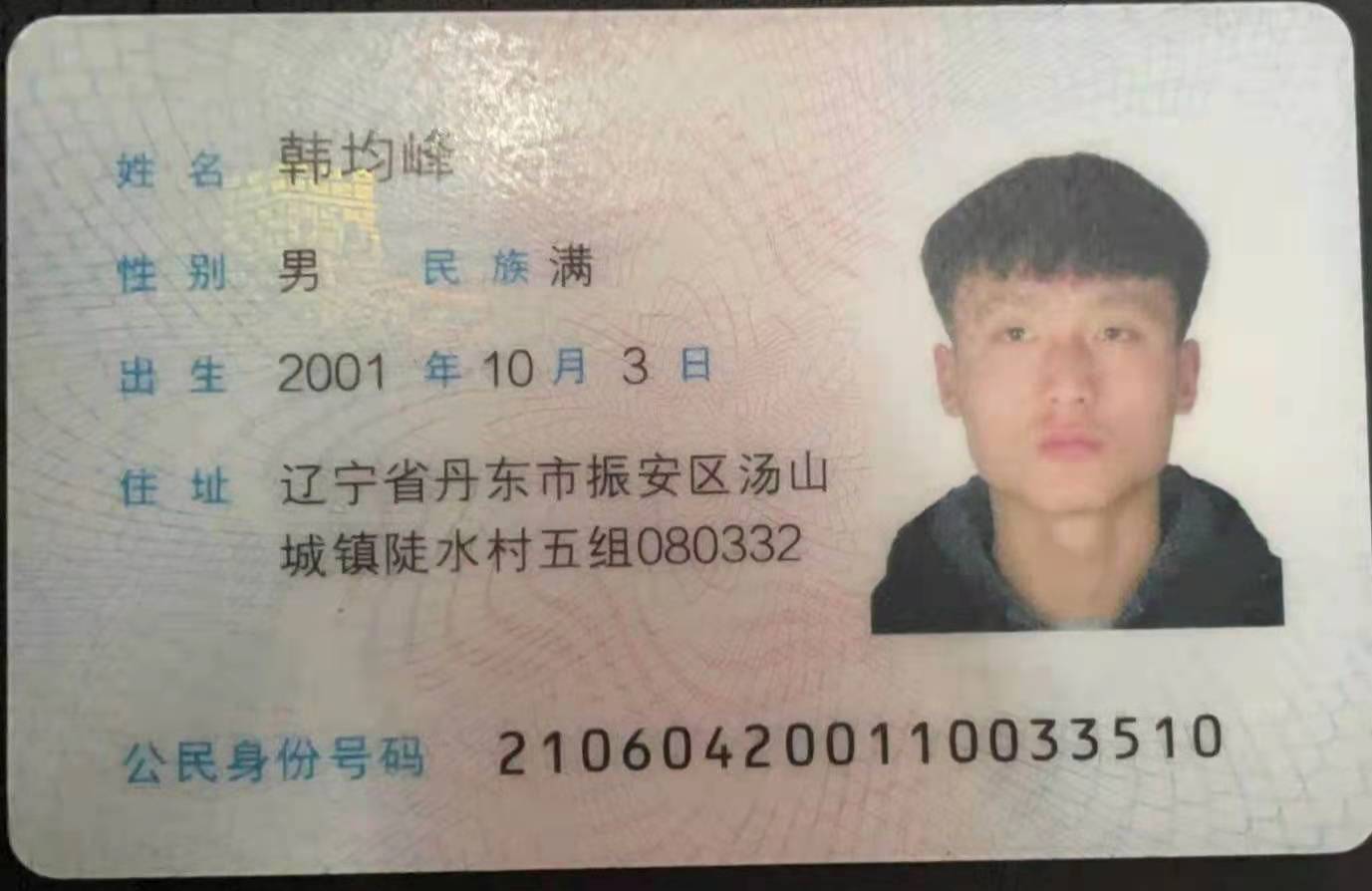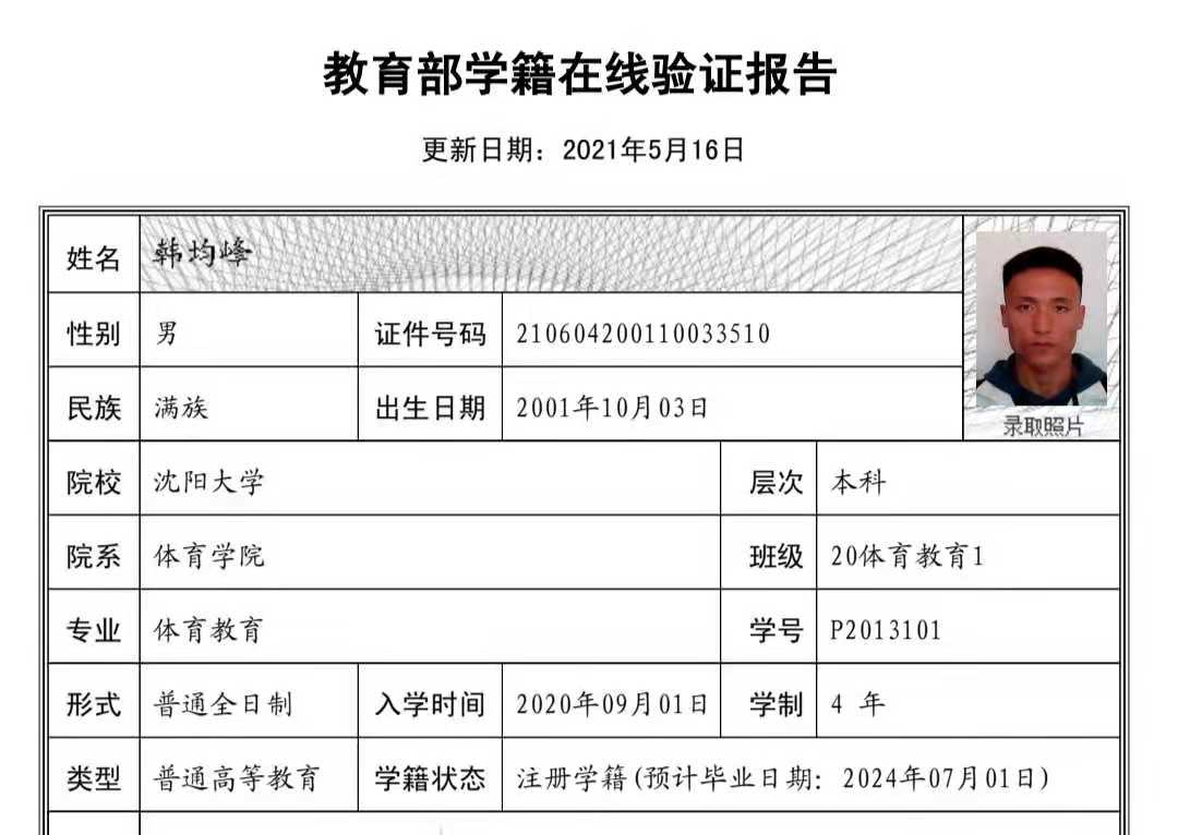| 5107 | 韩均峰 | 男 | 181cm | 70kg | 2001-10-03 | 210604200110033510 | 丁组 | ![]() |