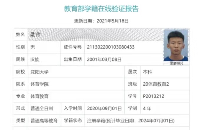 | 5105 | 梁帅 | 男 | 194cm | 80kg | 2001-03-08 | 211302200103080433 | 丁组 | ![]() |