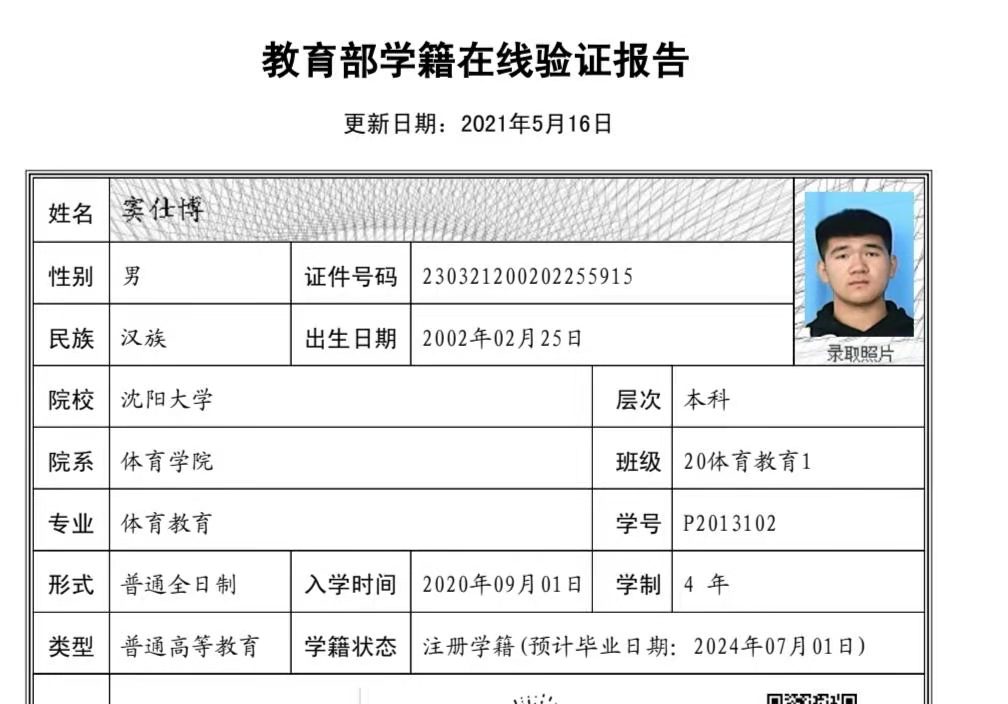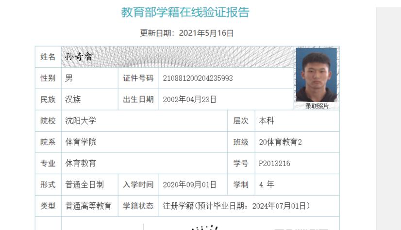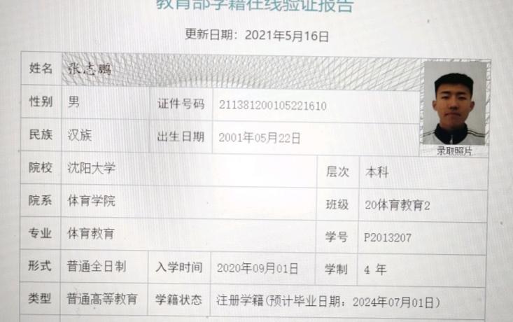 | 5109 | 张志鹏 | 男 | 190cm | 80kg | 2001-05-25 | 211381200105221610 | 丁组 | ![]() |