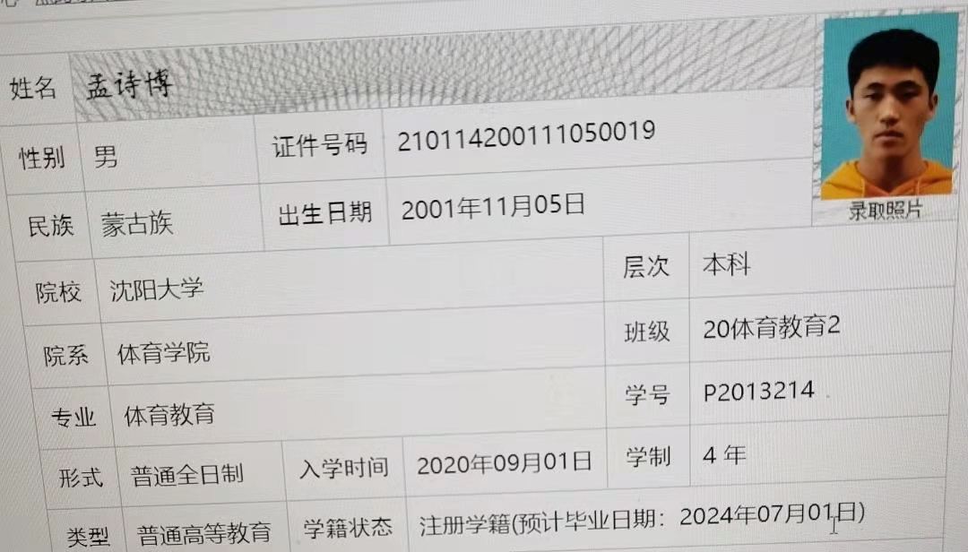 | 5111 | 孟诗博 | 男 | 186cm | 82kg | 2001-11-05 | 210114200111050019 | 丁组 | ![]() |