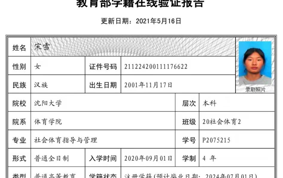 | 5117 | 宋雪 | 女 | 173cm | 63kg | 2001-11-17 | 211224200111176622 | 丁组 | ![]() |