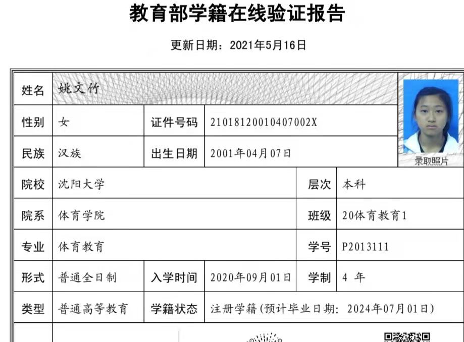 | 5114 | 姚文竹 | 女 | 166cm | 55kg | 2001-04-07 | 21018120010407002X | 丁组 | ![]() |
