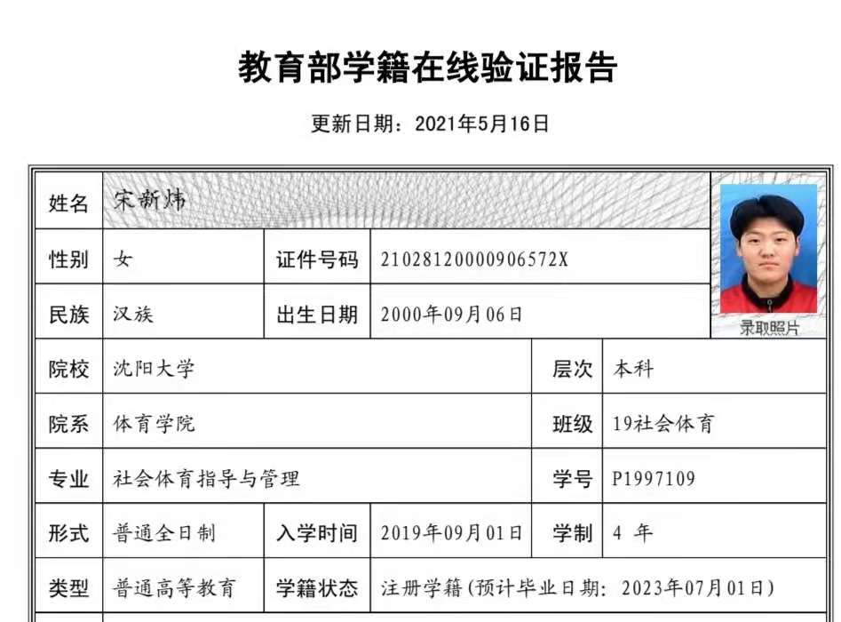 | 5116 | 宋新炜 | 女 | 178cm | 90kg | 2000-09-06 | 21028120000906572X | 丁组 | ![]() |