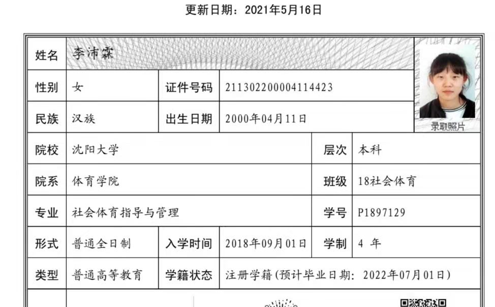 | 5113 | 李沛霖 | 女 | 168cm | 52kg | 2000-04-11 | 211302200004114423 | 丁组 | ![]() |