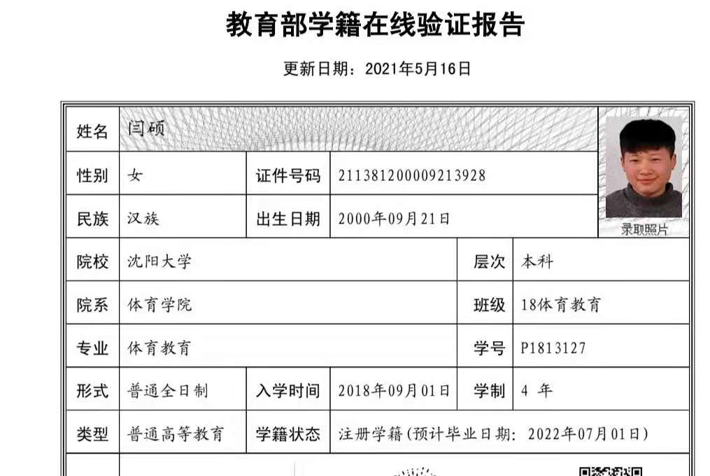 | 5112 | 闫硕 | 女 | 172cm | 72.5kg | 2000-09-21 | 211381200009213928 | 丁组 | ![]() |