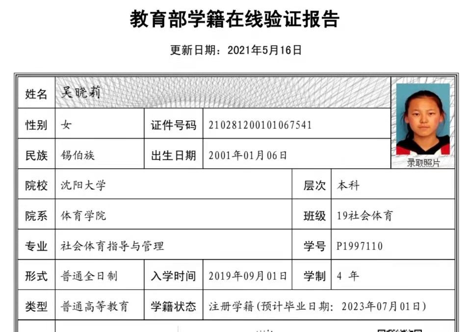 | 5119 | 吴晓莉 | 女 | 168cm | 60kg | 2001-01-06 | 210281200101067541 | 丁组 | ![]() |