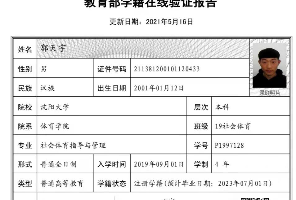 | 5120 | 郭天宇 | 男 | 173cm | 70kg | 2001-01-12 | 211381200101120433 | 丁组 | ![]() |
